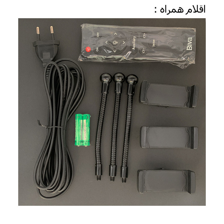 سه عدد هولدر جهت نصب گوشی، دو عدد باتری نیم قلم، یک عدد ریموت کنترل، یک عدد کابل برق و یک کیف همراه جهت حمل لوازم