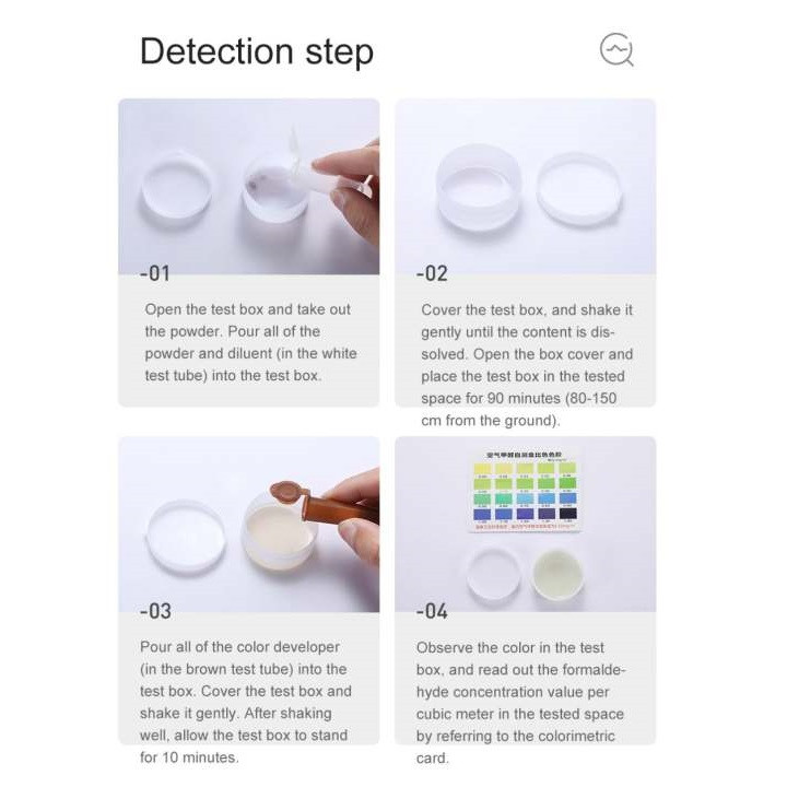 سپس پوشش درب را بر دارید و ظرف را در محلی که می خواهید هوای آن مورد آزمایش قرار بگیرد بگذارید. توجه داشته باشید که ظرف باید حدود 90 دقیقه و در ارتفاع 80 تا 150 سانتی متری از سطح زمین قرار بگیرد. بعد از این مرحله باید محتوای درون تیوب قهوه ای رنگ را درون ظرف تست بریزید، پس از این مرحله باید دوباره درب ظرف را پوشش داده و آن را ببندید و سپس ظرف را به خوبی تکان دهید و 10 دقیقه منتظر باشید. در مرحله آخر باید رنگ محتوای ظرف تست را با کارت تشخیص رنگی که درون پک قرار داده شده مقایسه کرده تا فرمالدهید موجود در هر متر مکعب را تشخیص دهید.