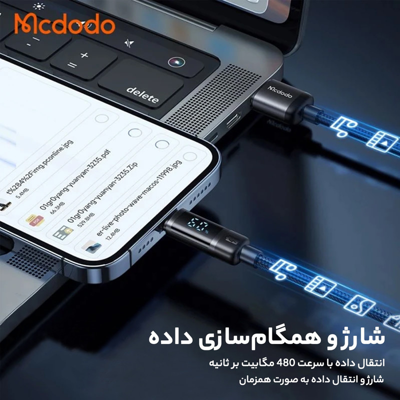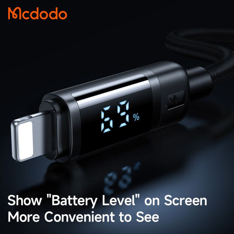 طول 1.2 متر | پشتیبانی از شدت جریان 3 آمپر | دارای کانکتور USB و لایتنینگ | دارای نمایشگر بر روی کانکتور لایتنینگ | قابلیت انتقال اطلاعات