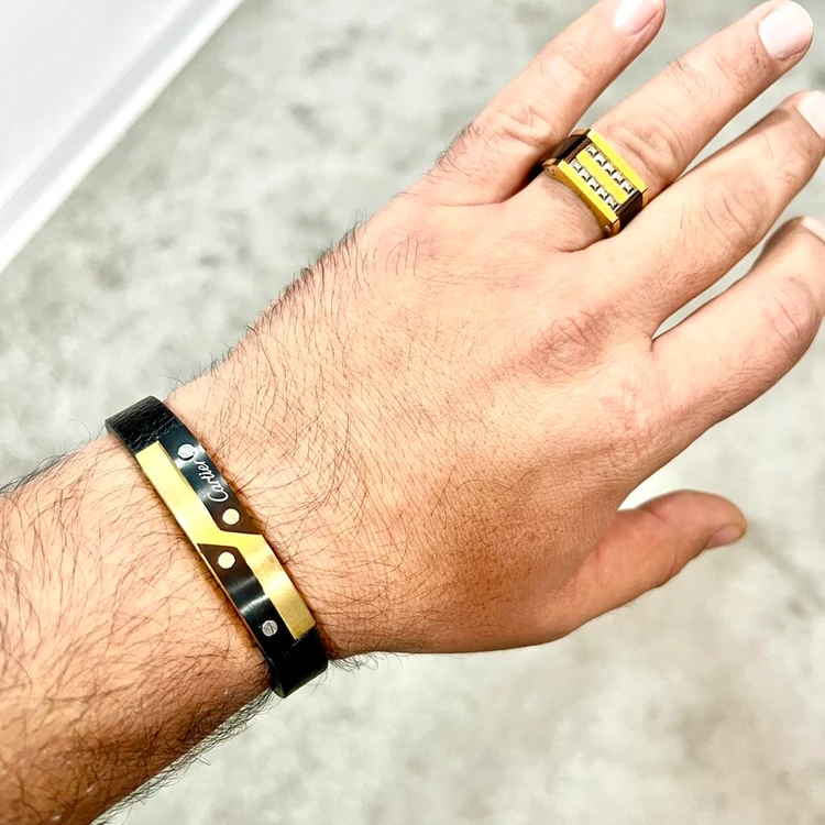 ست انگشتر و دستبند کارتیر چرم و استیل رنگ ثابت