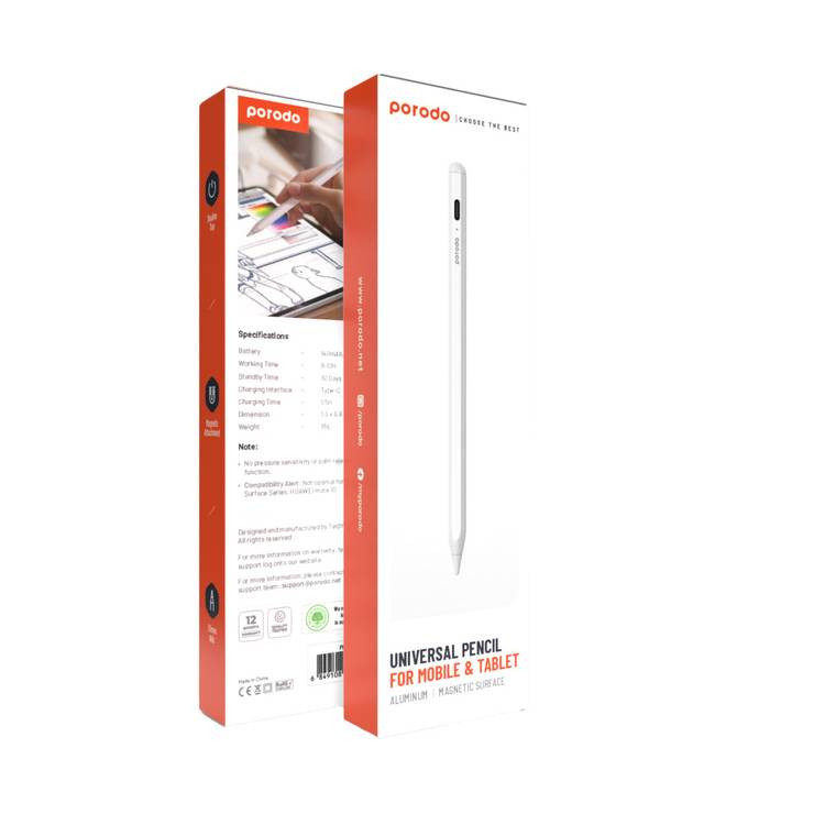 قلم لمسی جهانی پوردو برای موبایل و تبلت ابزاری شیک و همه کاره دردو رنگ سفید و مشکی است. خلاقیت و بهره وری دیجیتال شما را افزایش می دهد. نوک 1.5 میلی متری این قلم استفاده دقیق و روان را برای یادداشت ها، طرح ها و مسیریابی تضمین می کند. ویژگی دوبار ضربه زدن آسان، تغییر حالت ها را ساده می کند. اتصال مغناطیسی آن در صورت عدم استفاده، آن را ایمن نگه می دارد. این مداد دارای یک باتری 140 میلی آمپر ساعتی است که برای 8 تا 10 ساعت استفاده مداوم و یک دوره آماده به کار شگفت انگیز 30 روزه دوام می آورد. با رابط Type-C، شارژ آسان و سریع است. تنها 1.5 ساعت طول می کشد تا به ظرفیت کامل برسد. راحت و سبک است و تنها 16 گرم دارد و ابعاد آن 1.0 x 8.9 x 166 میلی متر است. مداد جهانی Porodo برای حرفه ای ها، دانش آموزان و خلاقان ایده آل است. این طراحی و عملکرد را ترکیب می کند و با بسیاری از دستگاه های تلفن همراه و تبلت ها کار می کند.