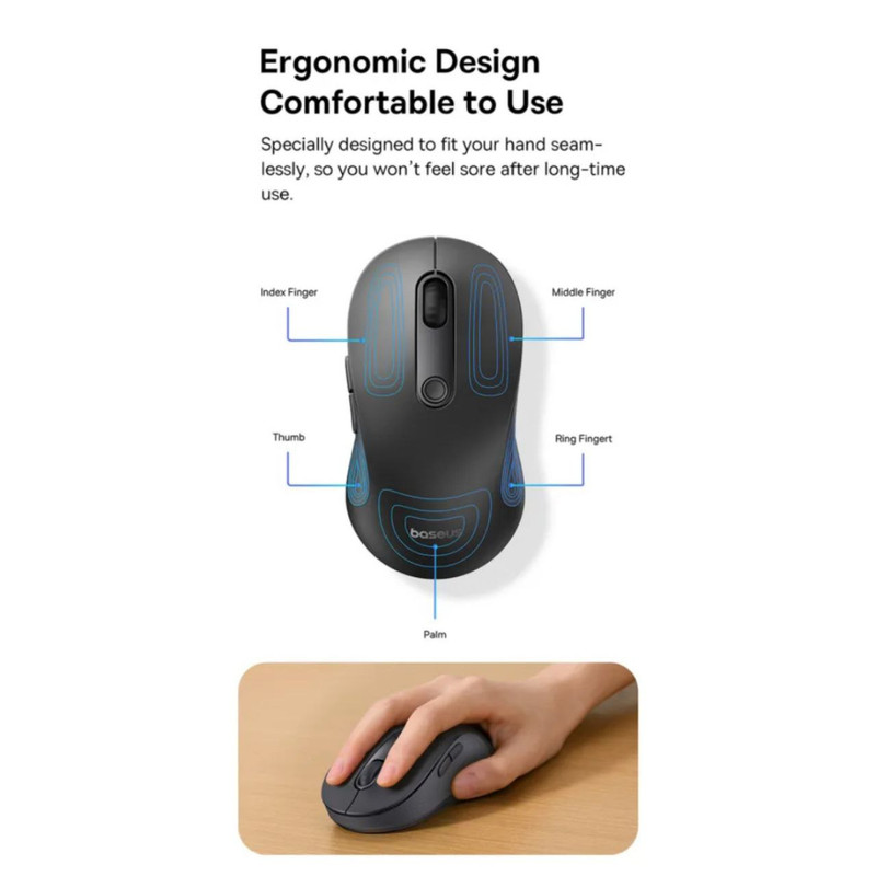 طراحی شیک و زیبای ماوس بی سیم ارگونومیک Baseus F02 جلب توجه می کند و امکان استفاده از آن را در محیط های اداری و خانگی فراهم می کند. و شکل ارگونومیک منحصر به فرد، موقعیت راحت دست را در حین استفاده تضمین می کند و از خستگی و تنش جلوگیری می کند.