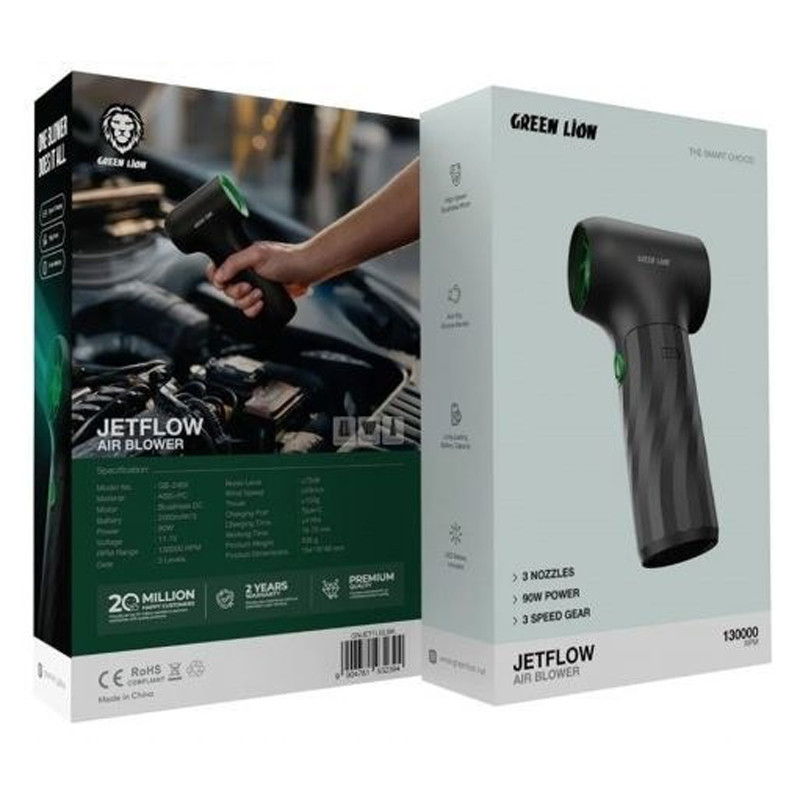سرعت موتور: 130,000 دور در دقیقه سرعت باد: بیش از 55 متر بر ثانیه قدرت موتور: 90 وات باتری: 2000 میلیآمپر ساعت × 3 زمان کارکرد: بین 15 تا 75 دقیقه (بسته به تنظیمات سرعت) سطوح تنظیم سرعت: 3 سطح دسته ضد لغزش: سیلیکونی نشانگر وضعیت باتری: LED