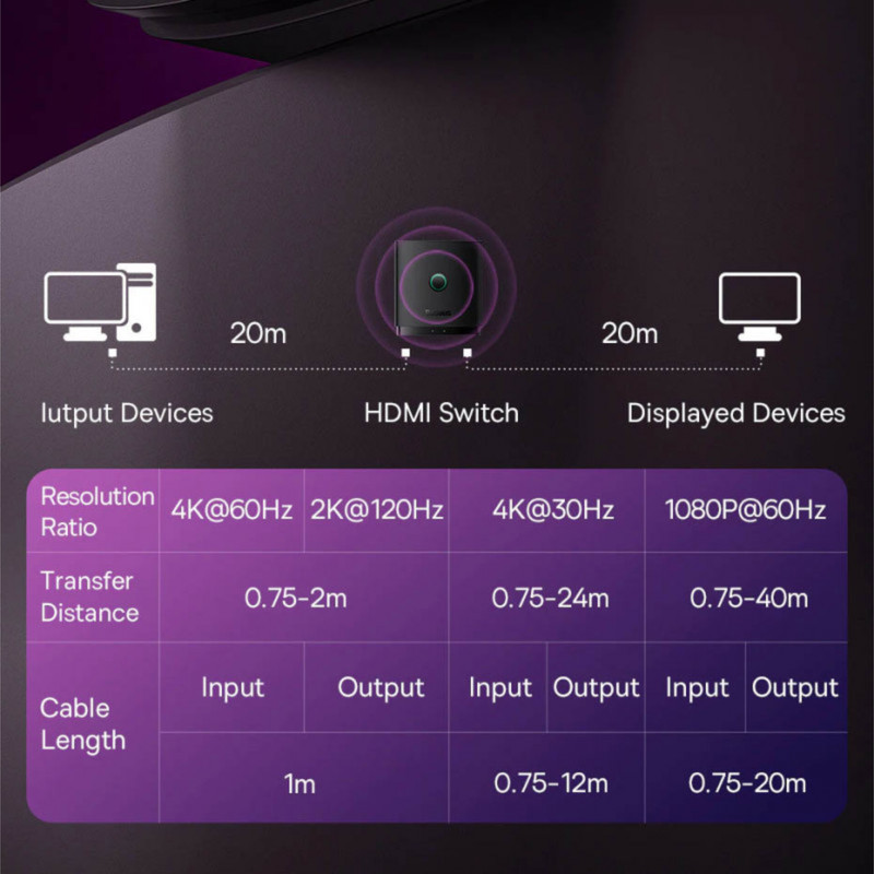 روی بدنه آن سه درگاه HDMI طراحی شده و امکان اصال در دو حالت برای شما فراهم است. به این صورت که در حالت 2 IN 1 OUT، میتوانید دو دستگاه را به یک صفحه، به عنوان مثال یک مانیتور، متصل کنید. در این حالت ابتدا تصویر تجهیزات متصل شده نمایش داده میشود. حالت 1 IN 2 OUT به شما امکان میدهد یک دستگاه را به دو نمایشگر متصل کنید. با نشانگر داخلی از وضعیت آداپتور مطلع خواهید شد. توجه: در حالت 1 IN 2 OUT، تنها یک صفحه می تواند تصویر دستگاه متصل را نمایش دهد.